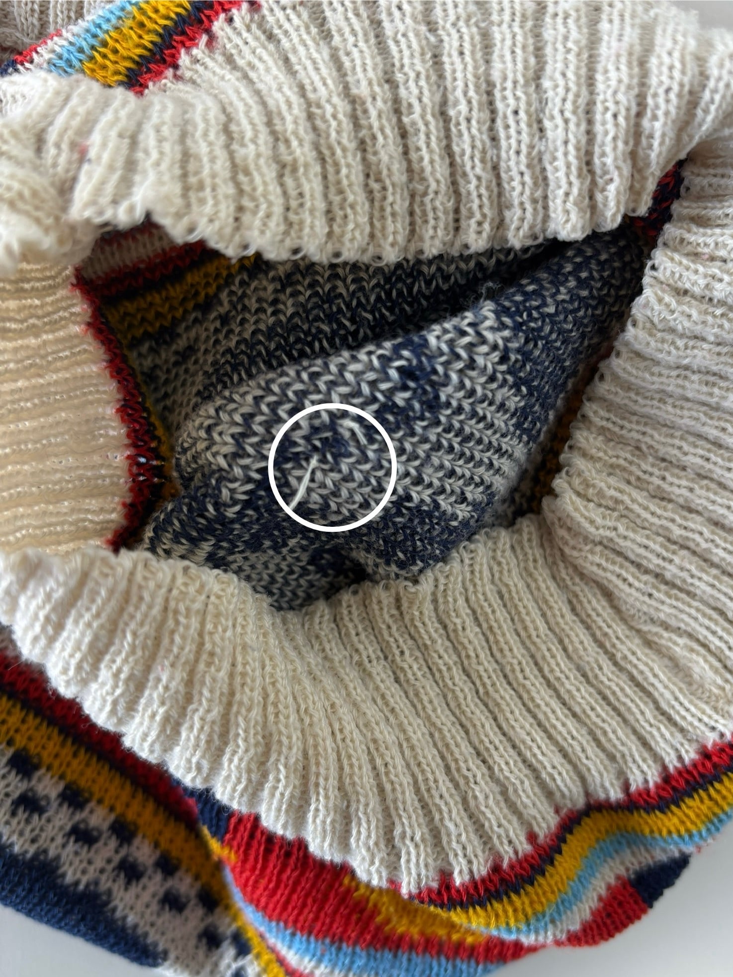 ・若干の毛羽立ちと毛玉、糸引き箇所、ほつれあり。