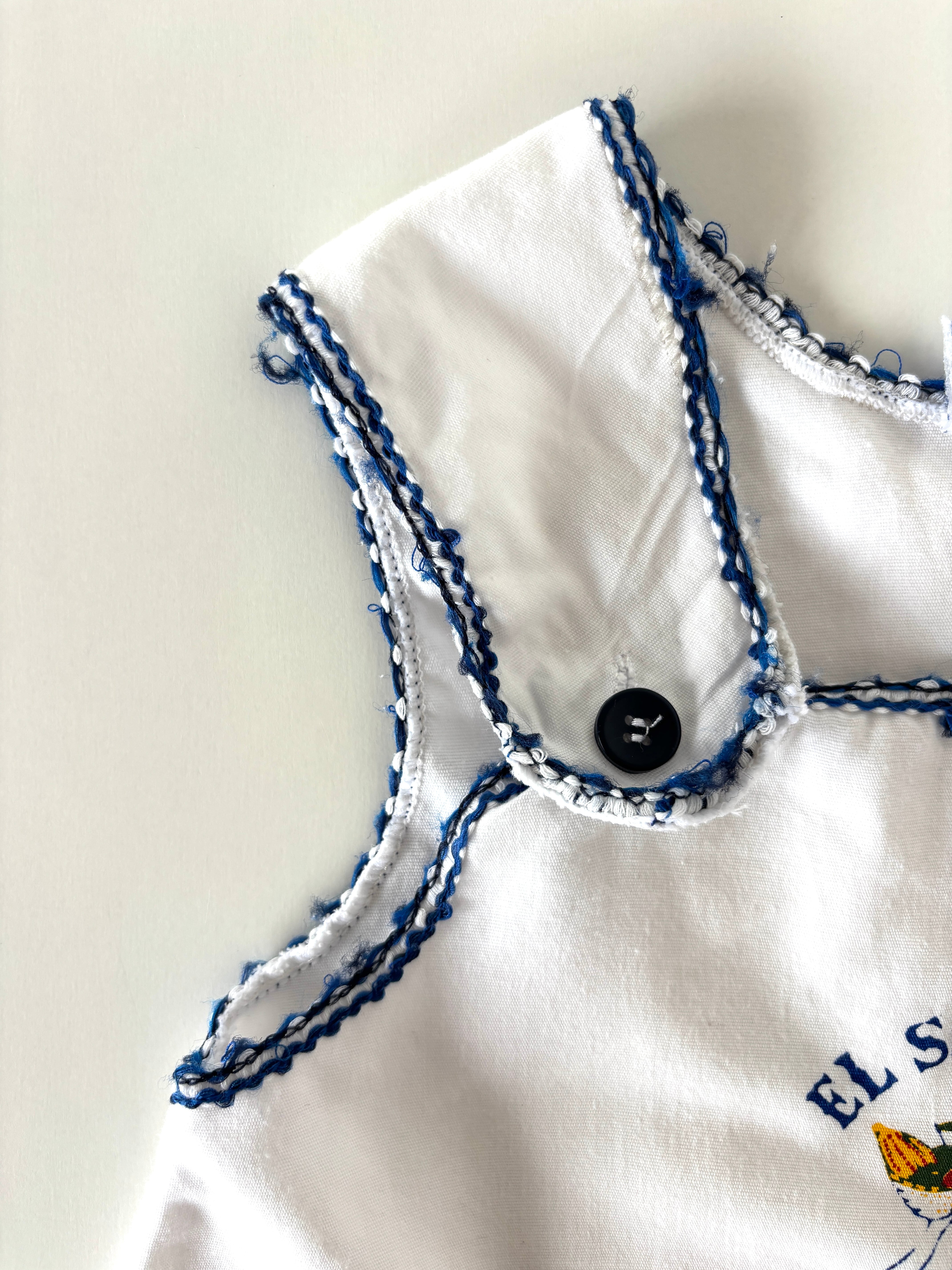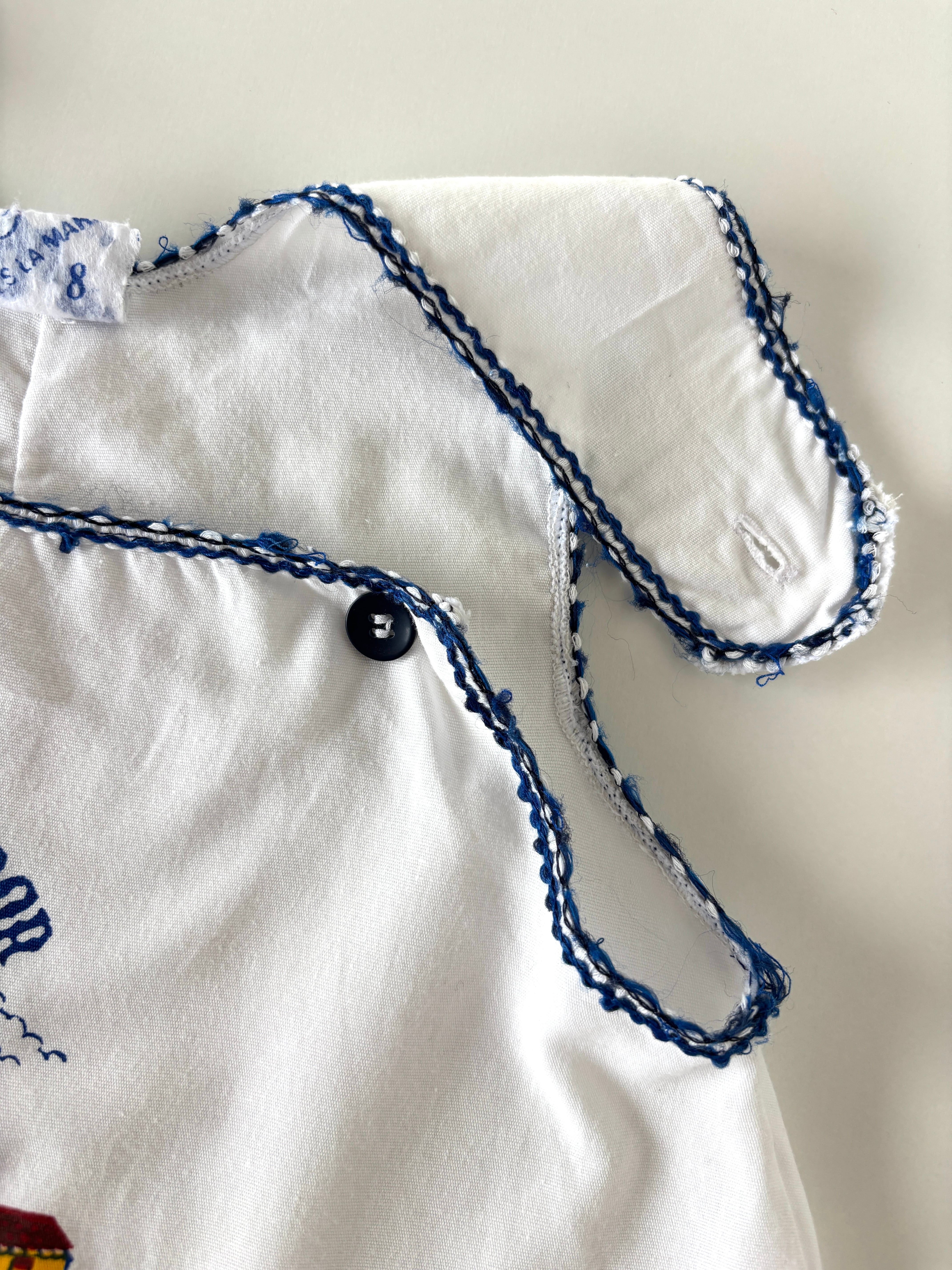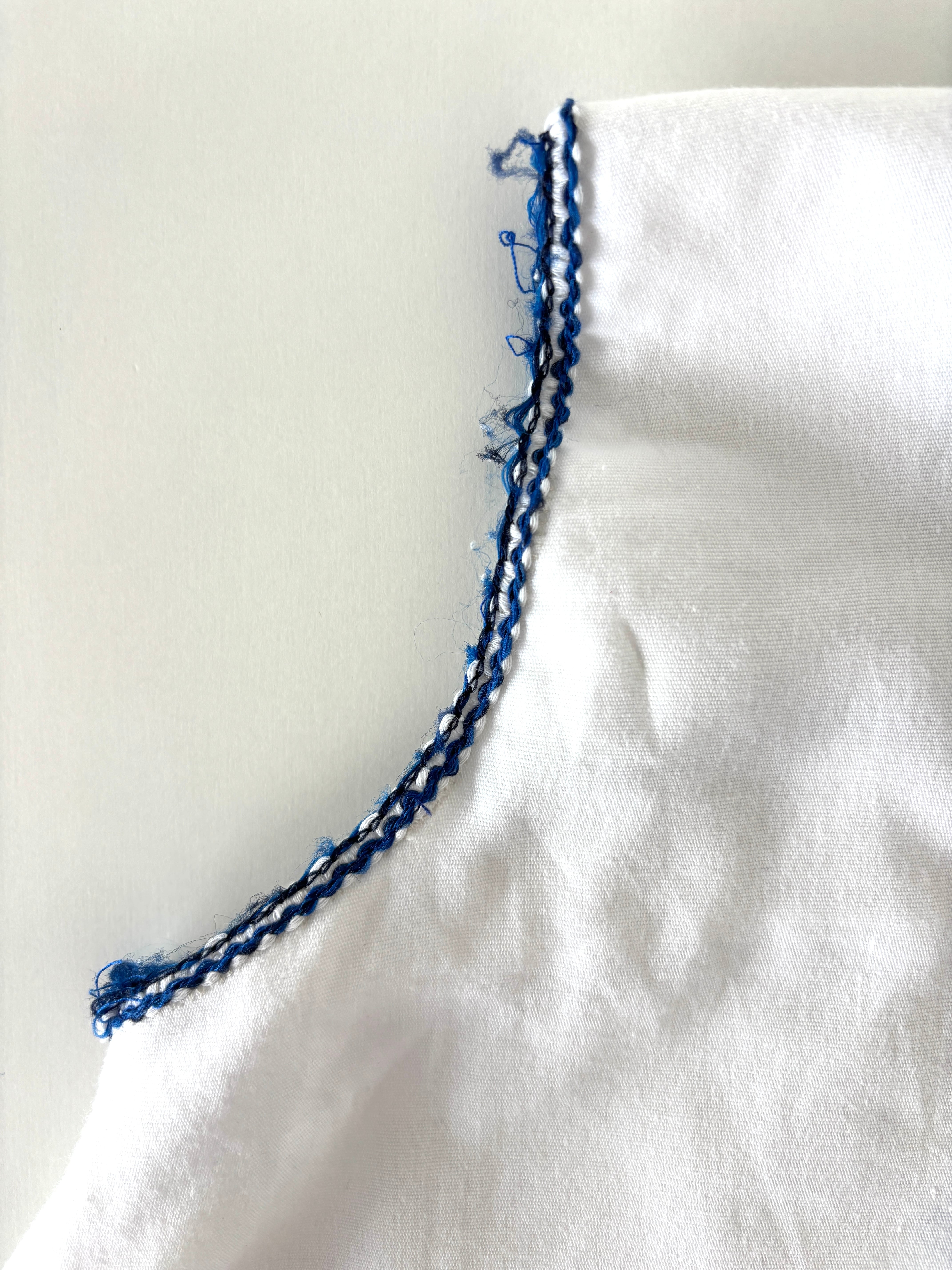 ・首周りや袖周りのブルー糸部分にほつれやダメージあり。