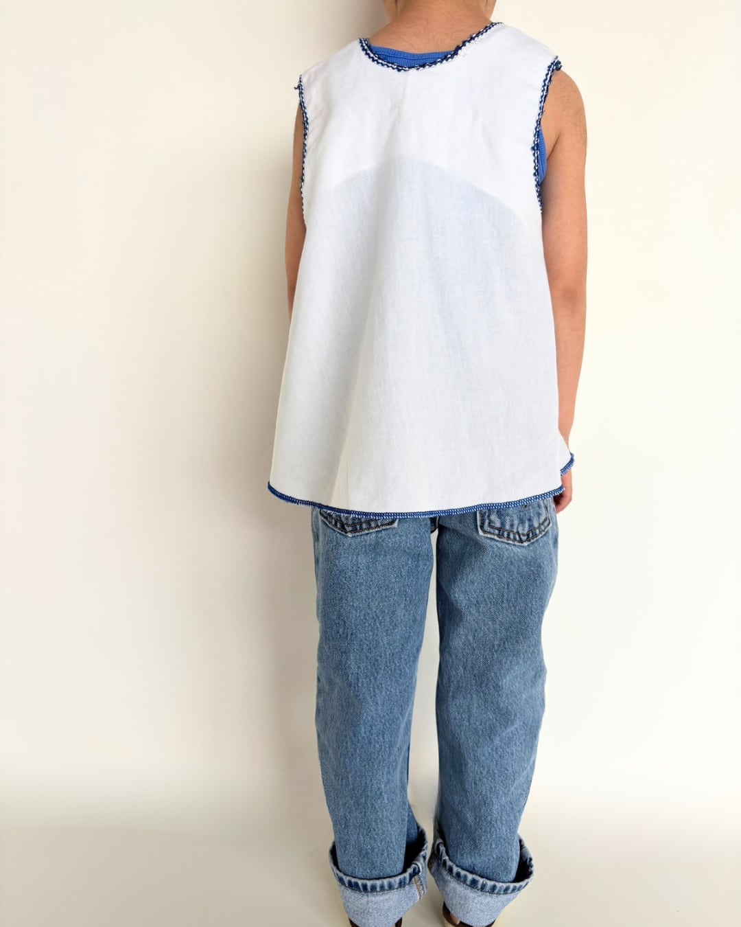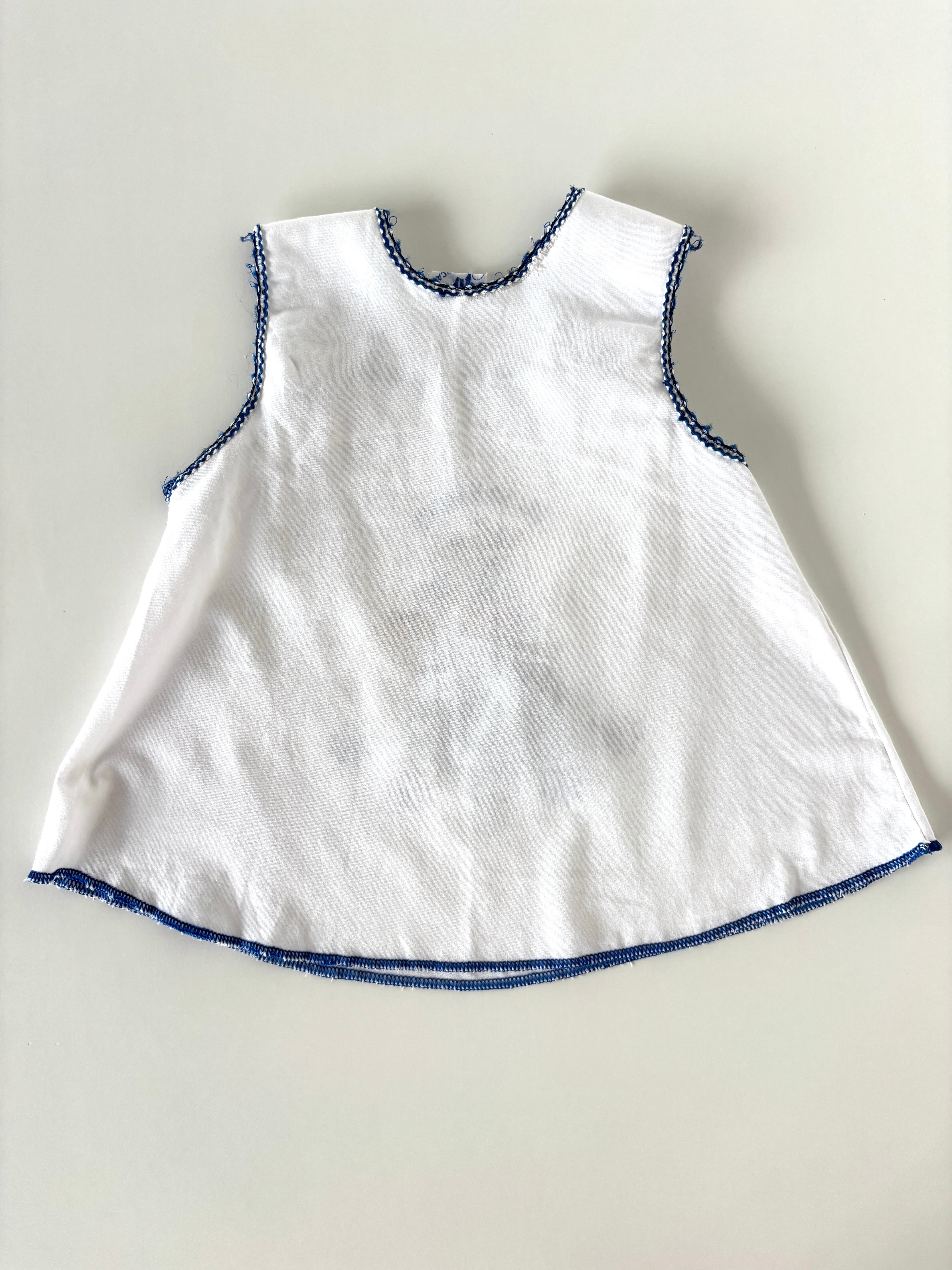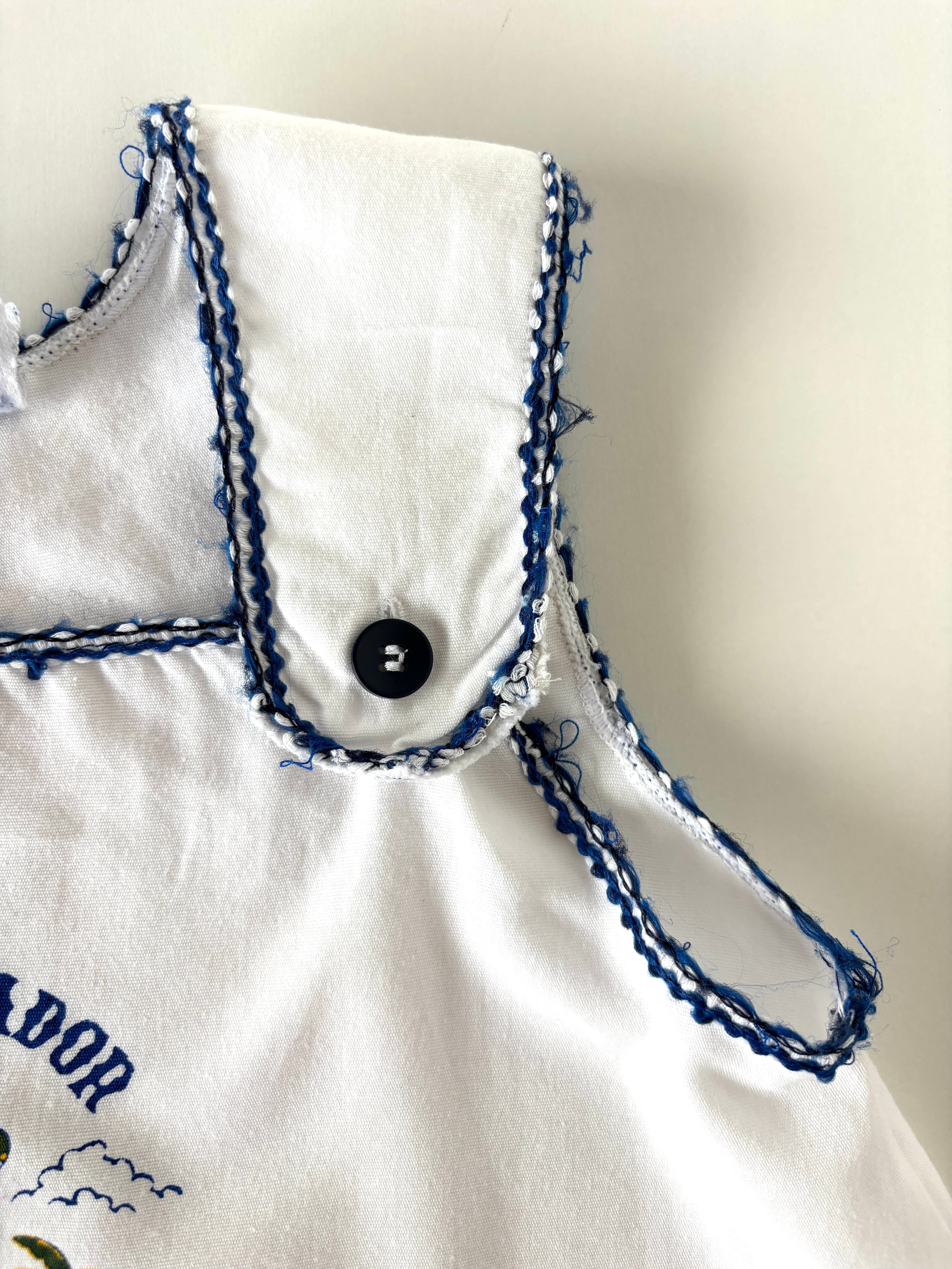 ・首周りや袖周りのブルー糸部分にほつれやダメージあり。